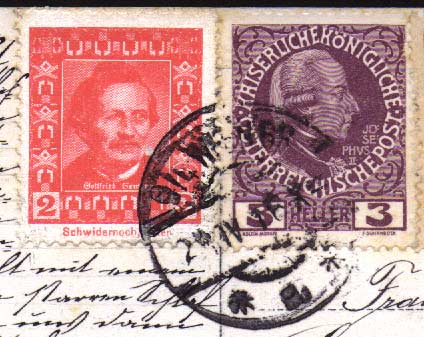 From 1908 to 1916, the lifetime of the definitive set, the emperors of Austria were matched to the postal rates so that the 10 Heller domestic rate was represented by Franz Joseph via a 10h stamp or, in the unlikely event of a shortage, by two 5h stamps of the same design. Remember, before 1908 Franz Joseph was on all the values of the definitive sets. Avoiding Franz Joseph and the current regime, our writer selected the smallest number of stamps required to make up the rate, using Joseph II, Leopold II and Karl VI. This necessitated encroachment into the writing space at the left of the card in order to include the label of Gottfried Semper. From this we can infer that his inclusion was probably important to the writer. Why?