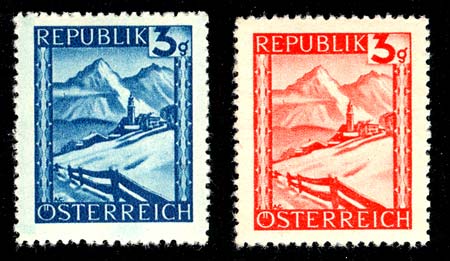 This is a study in the variations and errors which occur in the photogravure printing of stamps. It uses the senic definitive set issued by Austria in the mid 1940s. This set has several advantages. (1) It was produced in the early post war environment when resources were stretched thin, making it easy to find a wide and interesting array of varieties. (2) High volumes of many of these stamps were printed, creating printing problems while making the set relatively inexpensive and easy to collect. (3) Most of the stamps in the series were printed in two or three different colors, making it easier to document the appearance and persistence of varieties. Select the links below to see detailed illustrations of the listed variations. | ||
