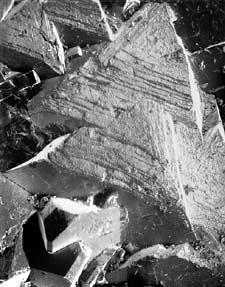CALCITE FROM THE EBURRU STATION HYDROTHERMAL LOCALITY Calicte occurs both in the form illustrated below and as fiberous needles. In addition, there is a mineral with a structure very similar to that illustrated below, but is translucent and often very, very pale blue. It usually occurs as a ring of crystals which circle a vug like a bathtub ring. Occassionally, they form an arch. This mineral is more resistant to acetic acid than normal calcite. | |