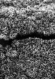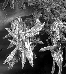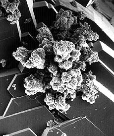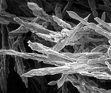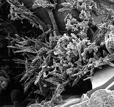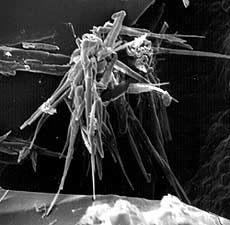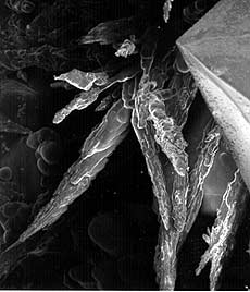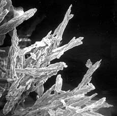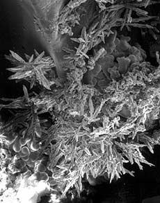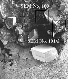 THIS TABLE LOOKS BEST WHEN VIEWED USING INTERNET EXPLORER. MAGNIFICATION FIGURES ARE FOR THE ORIGINAL SEMs, NOT FOR THE IMAGES YOU SEE ON YOUR COMPUTER SCREEN. I WILL BE ADDING SCALE BARS WHEN I HAVE TIME TO DO THE CALCULATIONS. Rosettes White. In cloumn-like structures on flat blades of an unidentified zeolite, possibly heulandite. |