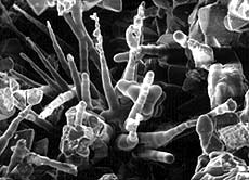 Fiberous Tufts White. Needles (?) covered with platy structures to form fiberous looking tufts growing on chabazite. See SEMs below for details. |