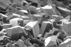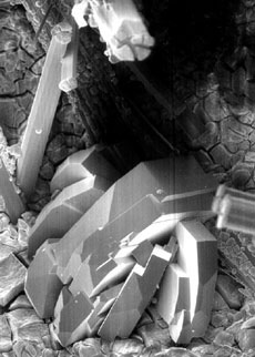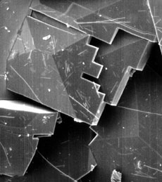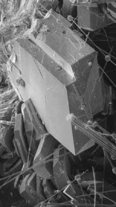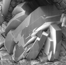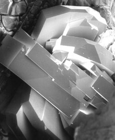 Colorless. Sometimes intergrown, thick plates with the typical coffin-top terminations. Same cluster appears from a different angle in SEM no. 60, below. |