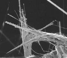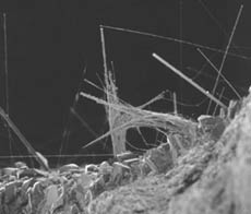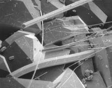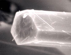 Colorless. Rods have accumulated smaller, fibrous crystals (see detail, immediately below). Long fine rods have knobs of unidentified maineral (see SEM 47, below). |