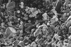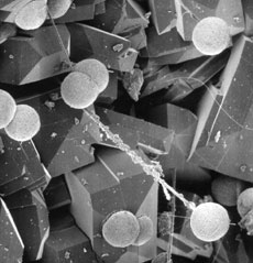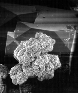Yellow-brown. Shperes with coral-like structure growing on fine rods of offretite (?) growing from a druze of heulandite. The setting for this mineral is seen in SEM nos. 40, 41 and 42, below. |