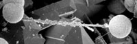 Enlargement of a portion of SEM no. 41 showing a lattice of small unidentified crystals twining around a rod of offretite (?). |