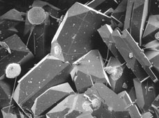 Colorless. Rosettes composed of polygonal plates of interlocking fiberous crystals which dgrow in interlocking clusters and as continuous cavity linings. Sometimes intergrown with erionite or offretite. |