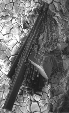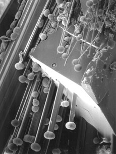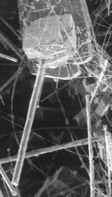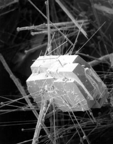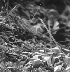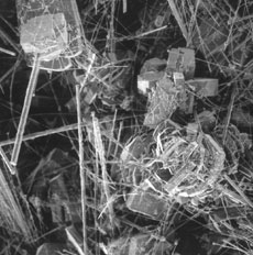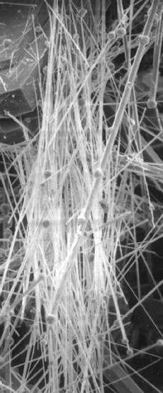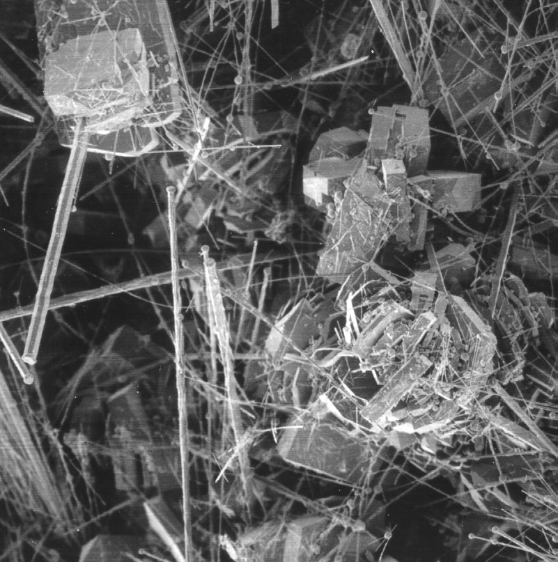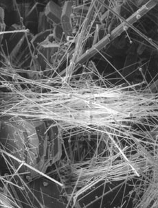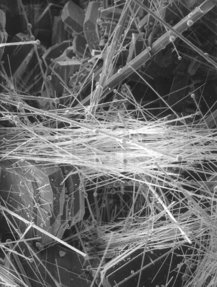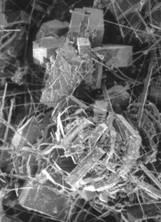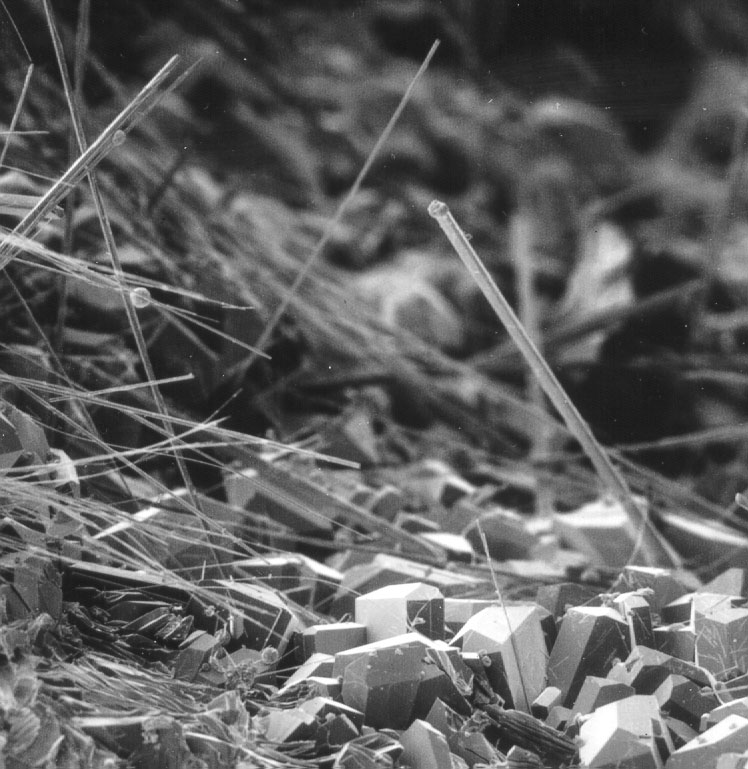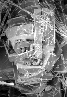 Erionite or offretite thatch Closer look at the erionite or offretite thatch seen in SEM no. 118. Move to SEM 119 for a more detailed view. |